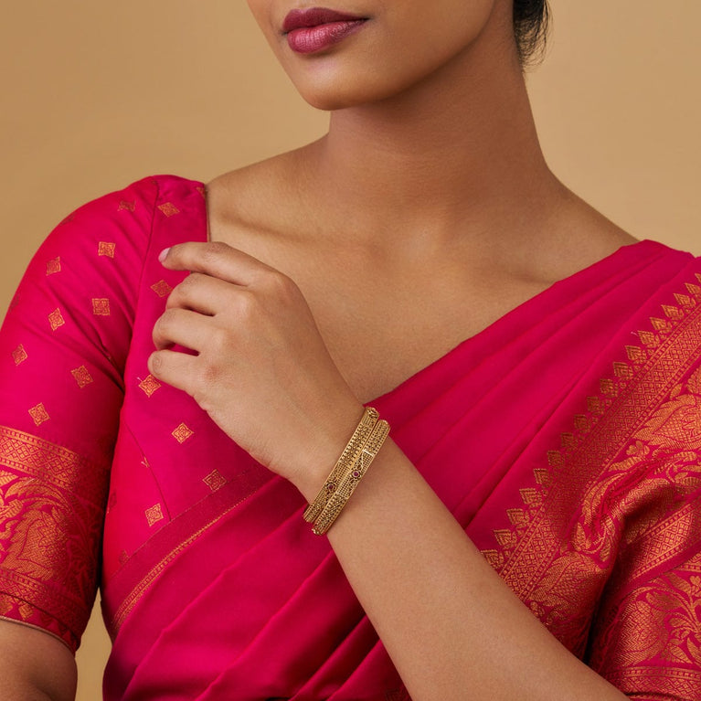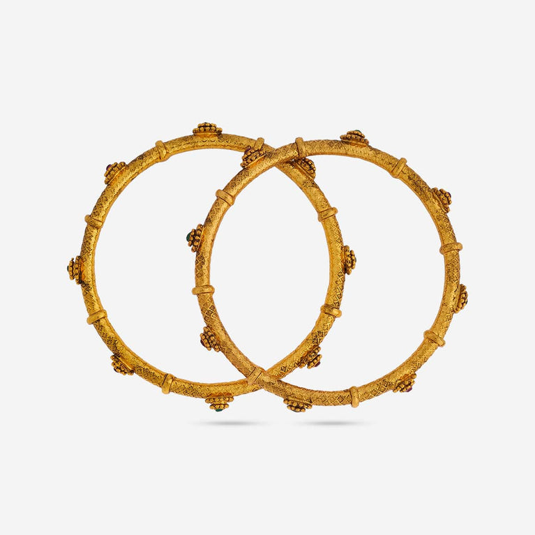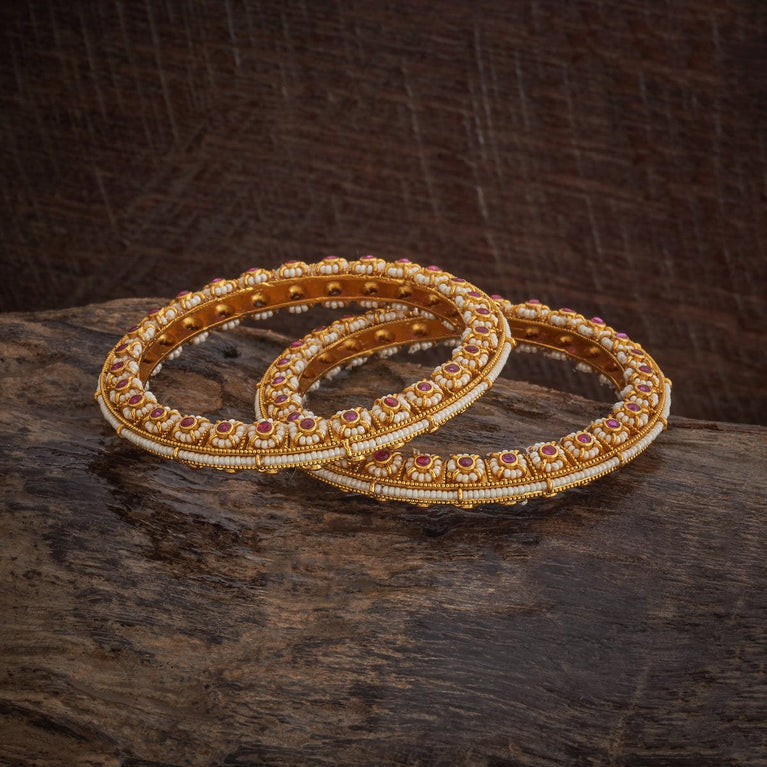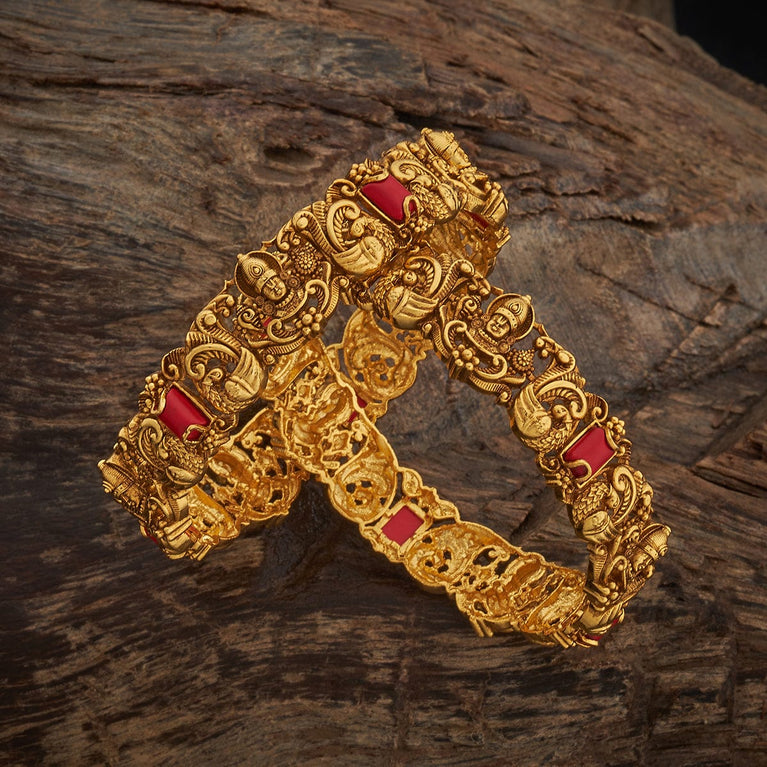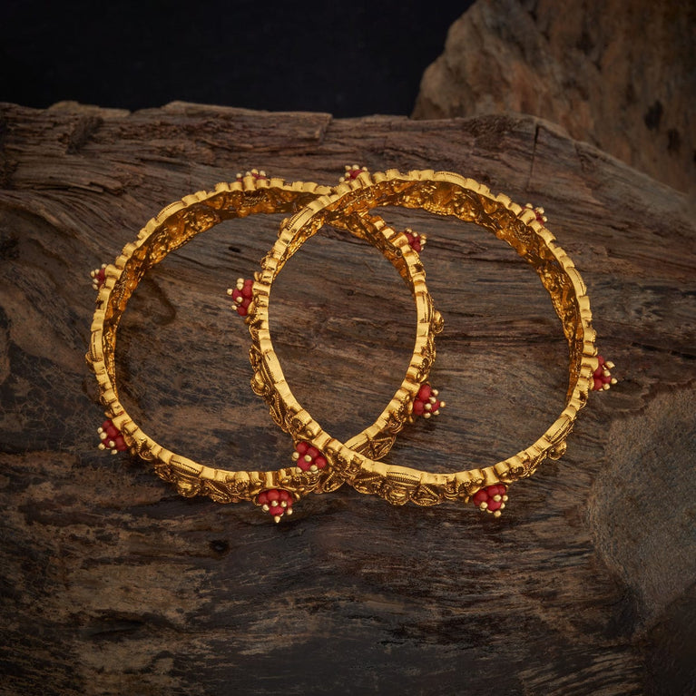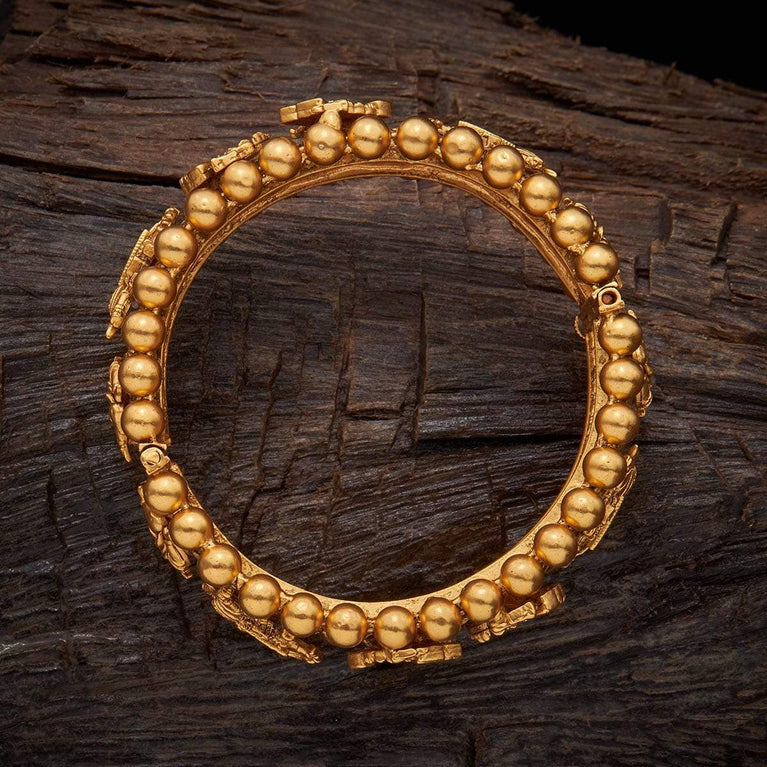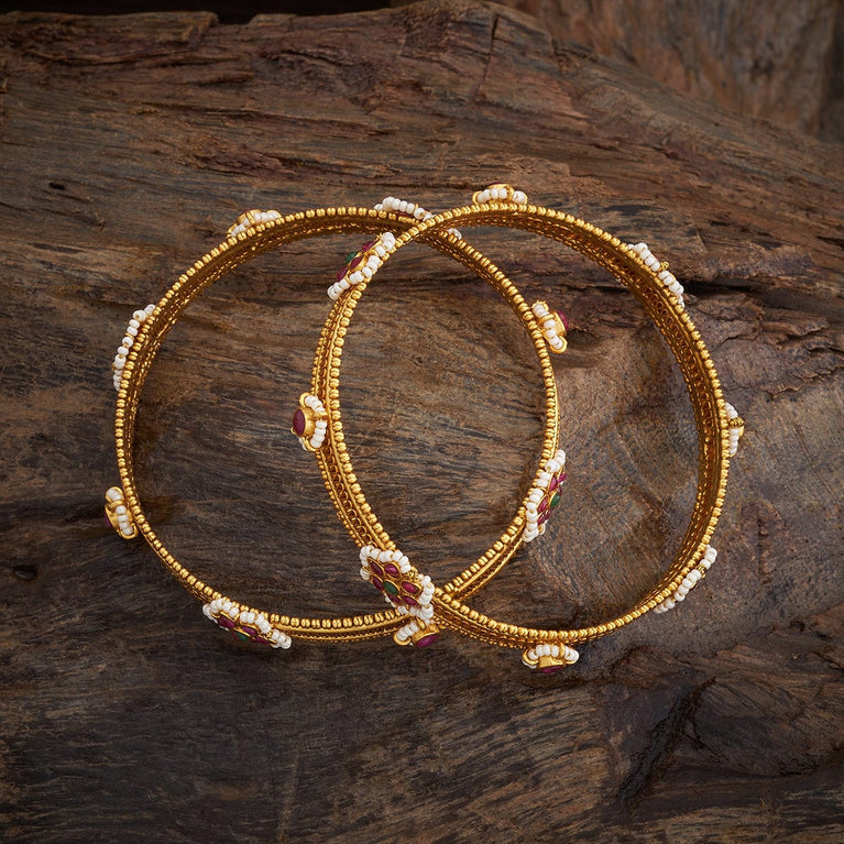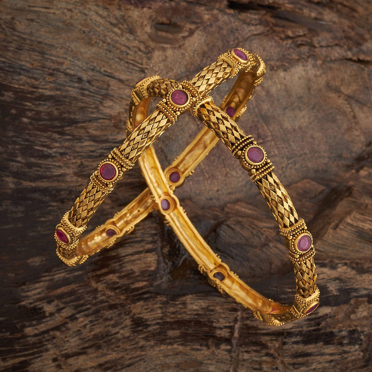 Kushal's Fashion Jewellery Antique BangleGet ready to fall in love with the minimalistic and eye-catching work details of our latest antique bangles this festive season. These bangles are adorned with gold polish and studded with shining ruby stones to complete your outfit in the best way possible. These bangles blend well with all occasions and outfits to make you the trendsetter.