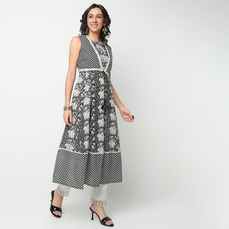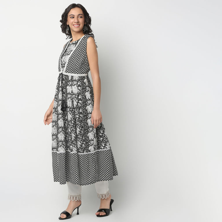 Calf Length Sleeveless Flare Fit All Over Print Kurta