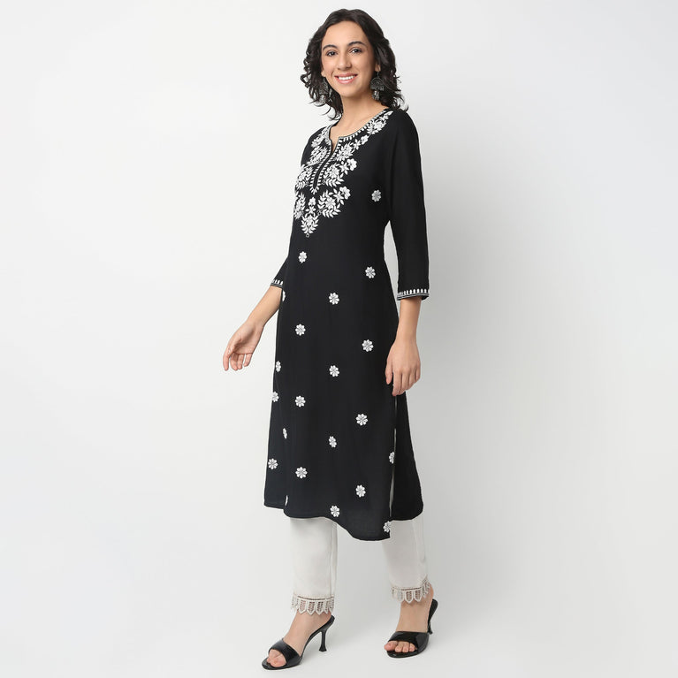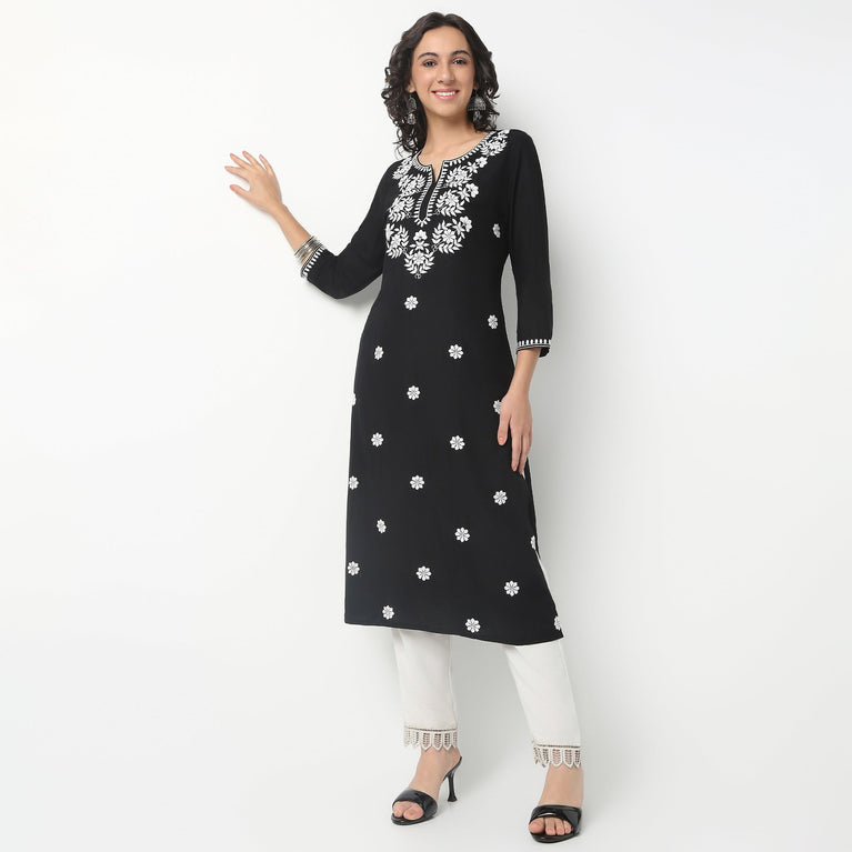 Calf Length Three-Fourth Sleeve Straight Fit Embroidered Kurta