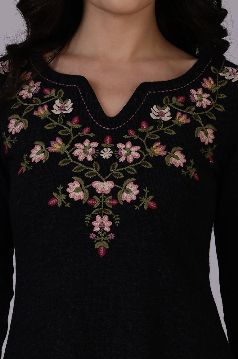 A whisper of winter elegance defines this beautiful kurta for women, presented in a rich Charcoal Heather shade. This apparel is thoughtfully designed to offer both exceptional warmth and sophisticated style, making it an essential addition to your cold-weather wardrobe. The absolute highlight is the stunning and intricate floral ornamentation that gracefully adorns the yoke, creating a beautiful frame around the chic keyhole neckline. Its flattering A-line silhouette flows effortlessly from the shoulders, creating a graceful shape that complements various body types. The full-length sleeves provide ample coverage and warmth, ensuring you stay cozy through the day's engagements. Crafted from a wonderfully soft and entirely opaque fabric, this ethnic tunic moves with you, promising complete comfort without any hint of transparency. The hemline is clean and subtly flared, enhancing the garment’s graceful drape and movement. This single-piece apparel is perfect for those seeking an impeccable blend of traditional craftsmanship and contemporary design. You'll find yourself reaching for this versatile embroidered A-line kurti for everything from casual brunches and workdays to quiet festive evenings. It's a timeless statement of refined taste, promising to be a cherished piece for seasons to come.