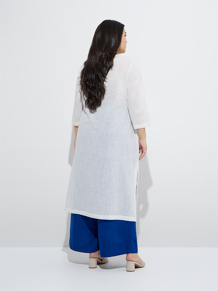 This white kurta from Diza showcases intricate schiffli embroidery across a graceful A-line silhouette. Spun from pure cotton, it features a crisp collar, a neat button placket, and three-quarter sleeves for a refined finish. Practicality meets style with a discreet slip pocket, making it an elegant yet functional addition to your wardrobe.
