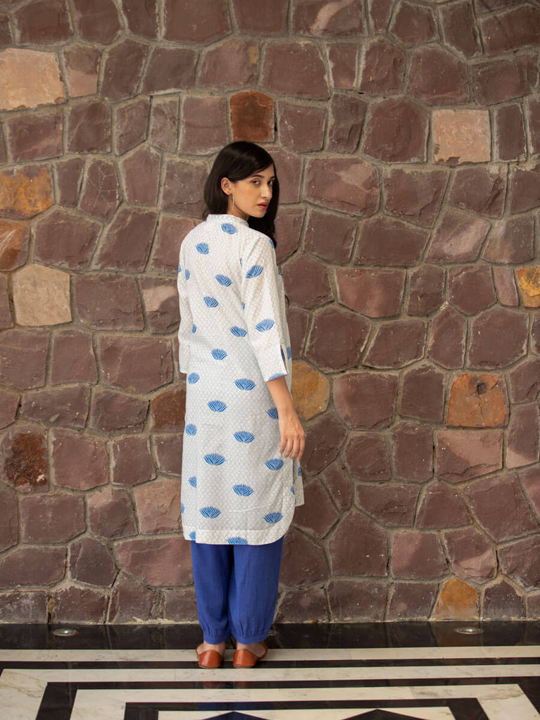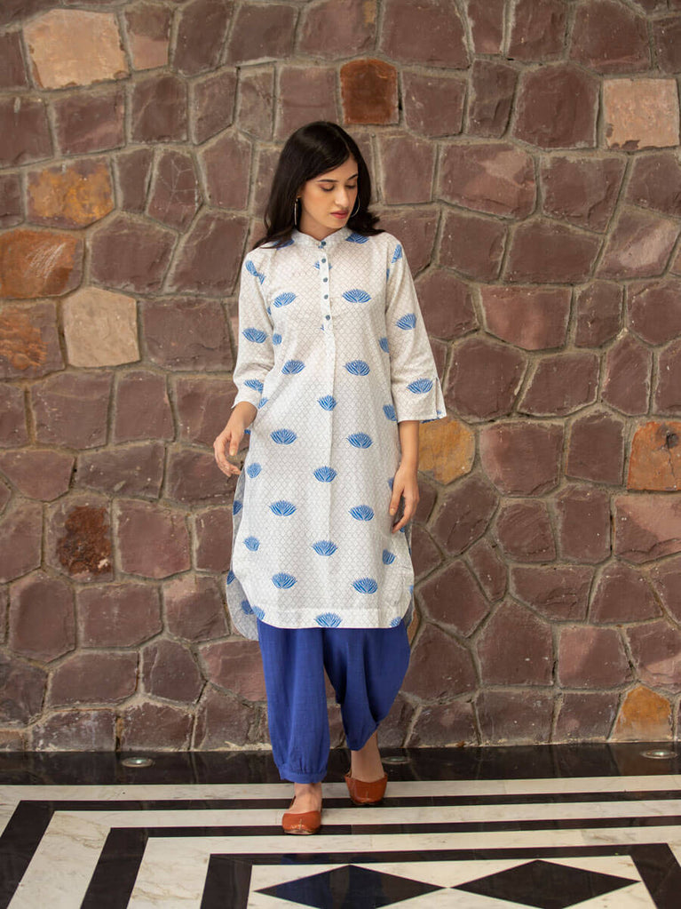 Inspired by heritage craftsmanship, this indigo flared kurta showcases the beauty of Daboo hand-block prints on soft pure cotton. The flowing flared silhouette offers graceful movement while keeping you comfortable through the day. Its natural indigo palette and artisanal print give this cotton kurta a rustic yet refined look, perfect for casual brunches or art-inspired evenings. The breathable fabric and easy fit make it a summer essential, whether styled with ethnic or contemporary pieces. Elevate your kurta for women collection with this handcrafted statement.