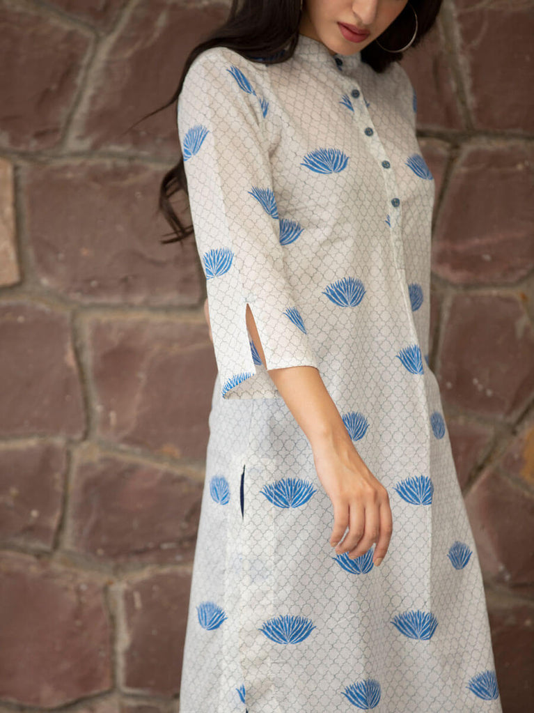 This white kurta from Diza is detailed with Sealife-themed prints, bringing a playful yet elegant touch to your look. Milled from pure cotton, the A-line silhouette is complemented by a round neck, button placket, and three-quarter sleeves. Practical side pockets add a layer of ease to the design.