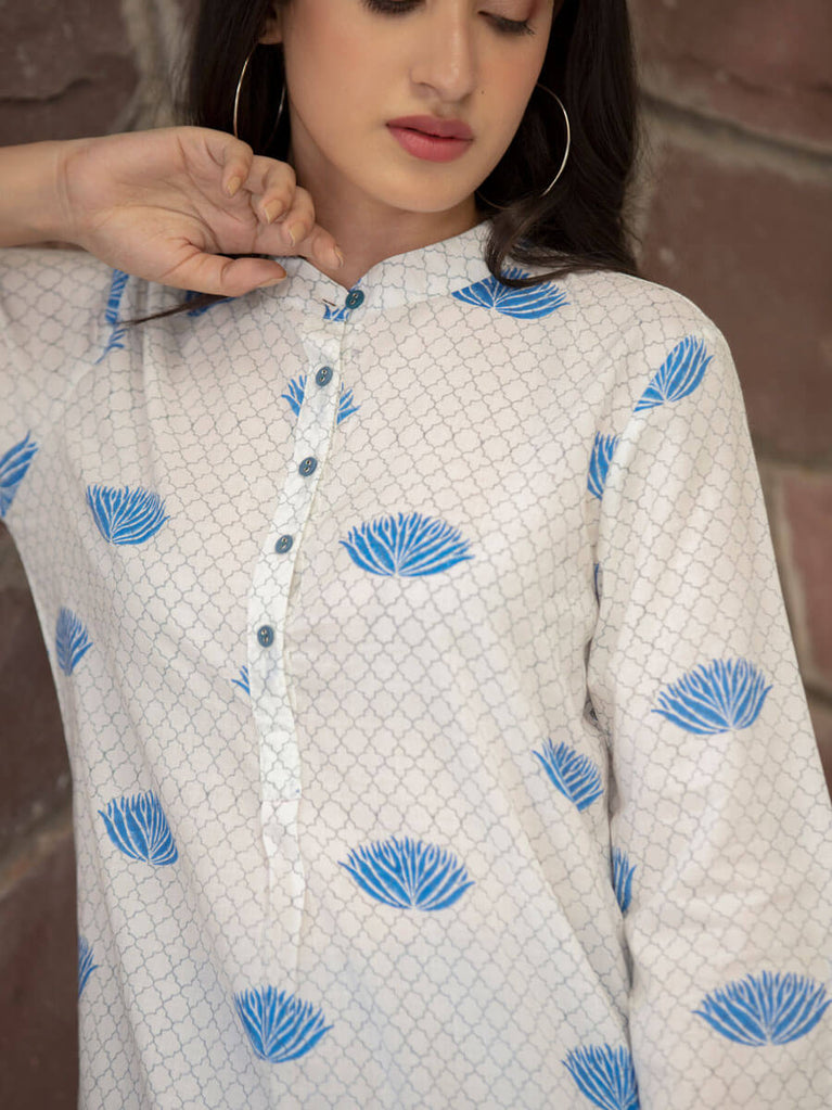 Diza White Tropical-Inspired Cotton A-Line Kurta