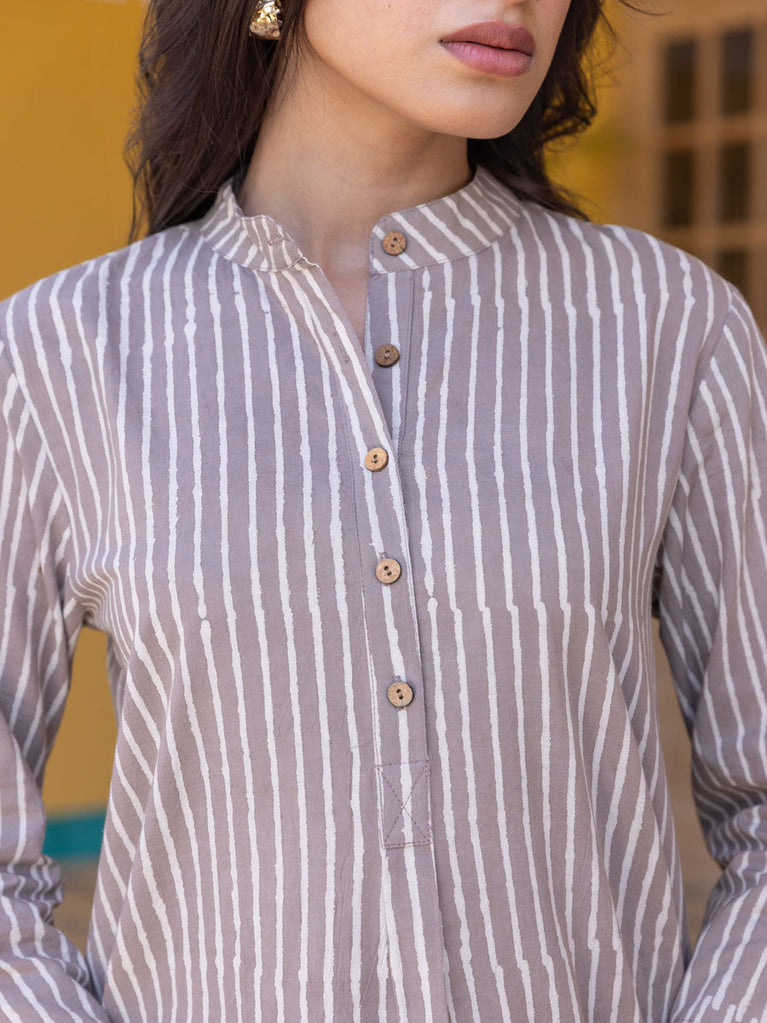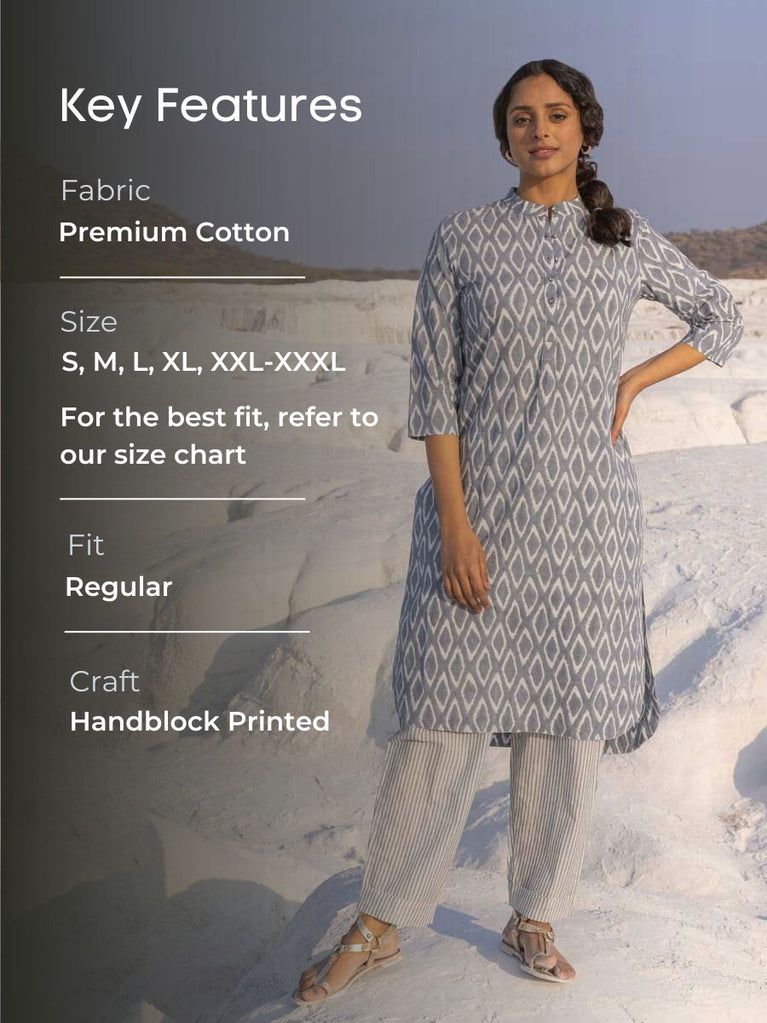 An everyday wardrobe essential, this straight kurta features meticulous handblock printing. It includes striped detailing along the sides and sleeves, complemented by a dori tie-up at the front and delicate sequins along the neckline.