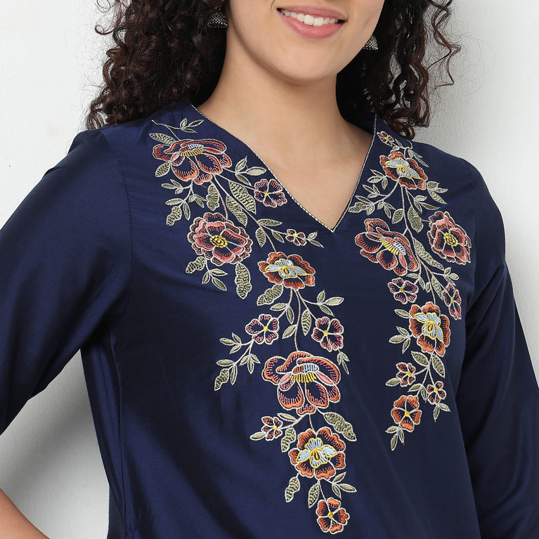 This embroidered pattern kurta has a round neck and three-fourth sleeve. Made from cotton, it is soft and comfortable to wear.