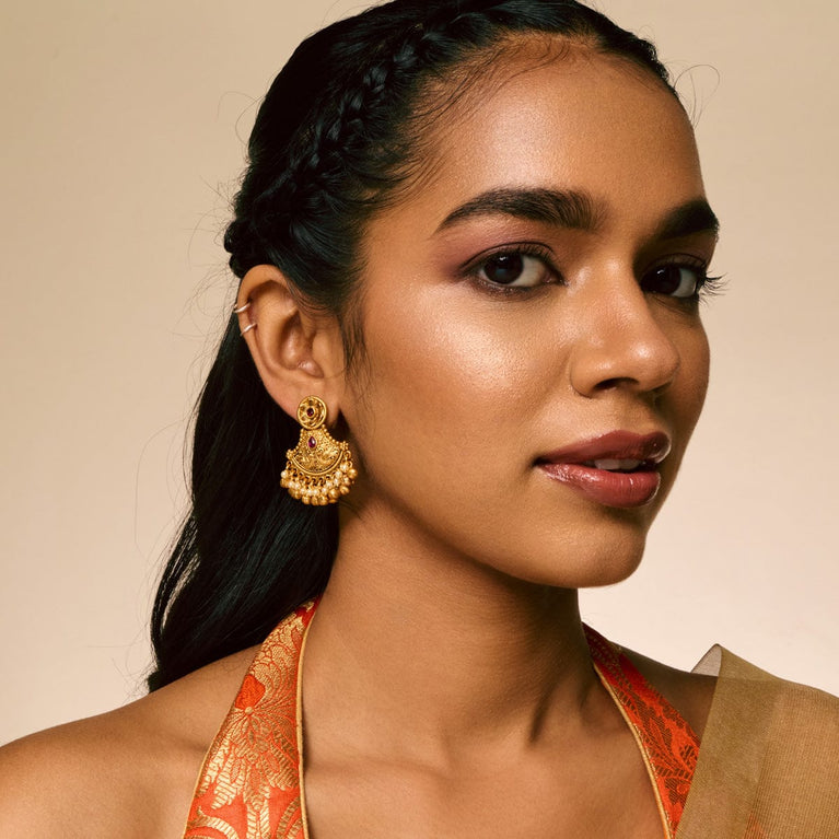 Intricate, festive, and contemporary, this fine ring is all. Adding a refreshing feel of full bloom, the white pearls, embossed gold plated floral design, floral rim, and hint of ruby stone, makes your look more exquisite and unique.