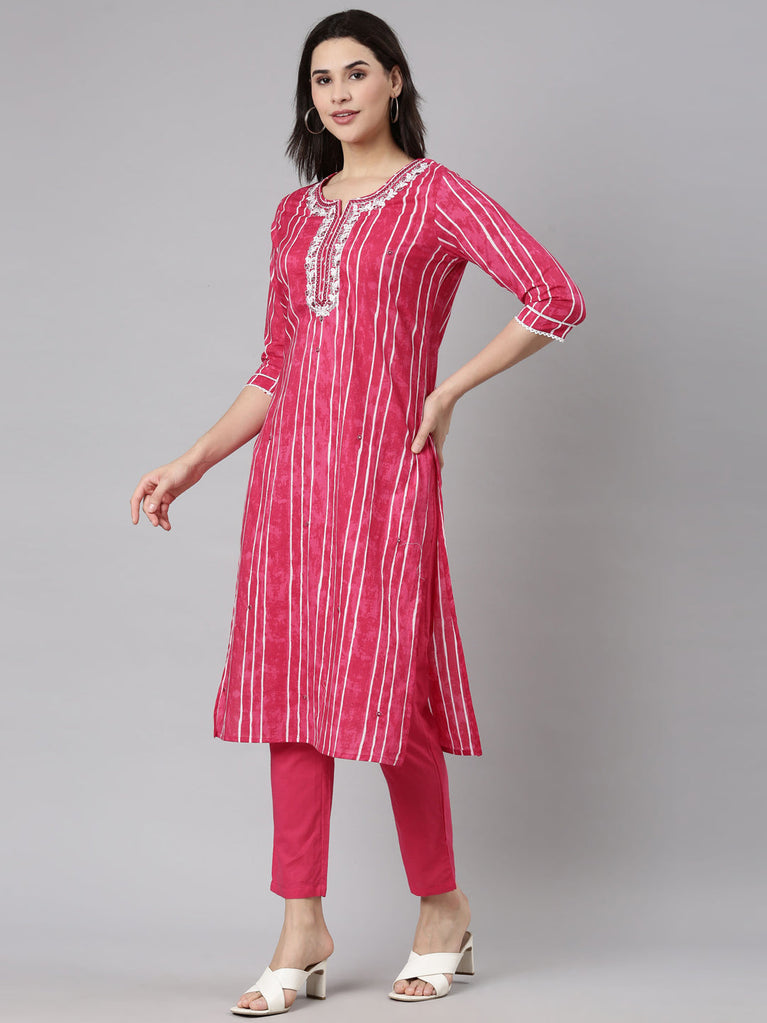 Neerus Pink Regular Straight Striped Kurta And Trousers With Dupatta