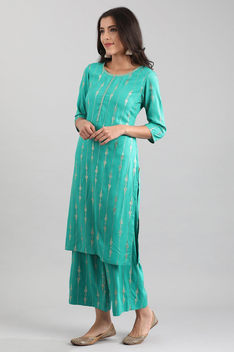 This set has a blue round neck straight kurta and matching printed palazzo pants.