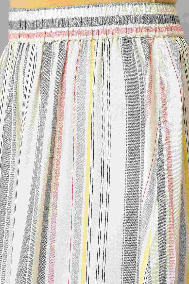 For A Stylish Weekend Getaway Get This Blue Stripe Printed A-Line kurta, Flattering Thread Embroidery On Yoke. It Is Coordinated With Black Solid Tights.