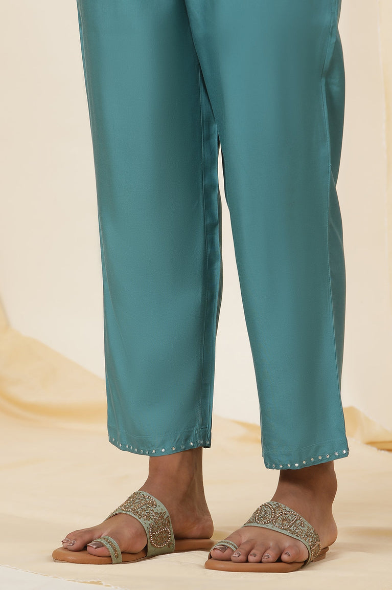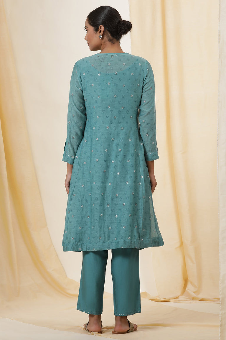 Crystal Teal Coloured Cotton Silk Panelled Kurta In Round Neck. This Rogan Block Printed Kurta Has Zari Embroidery On Neckline And Dori Tie-Up. It Further Features Kantha Work At Cuffs Of The Sleeves. It Is Paired With Matching Solid Straight Pants Which Is Accentuated With Mirror Work.