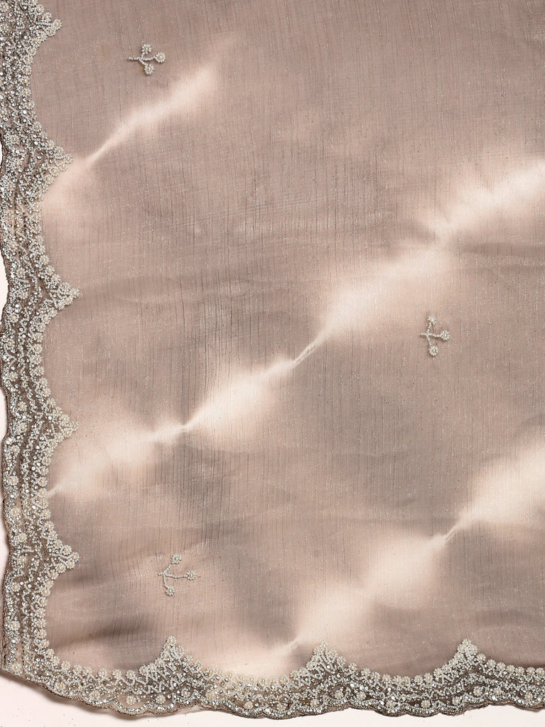 Elevate your ethnic wardrobe with this Grey Jimmy Organza Saree, featuring delicate tie-dye patterns paired with intricate hand embroidery. Crafted from lightweight organza, it offers a graceful drape and subtle sheen, perfect for formal occasions. The hand embroidery adds artisanal detail, enhancing its sophisticated appeal while ensuring each piece is uniquely crafted. This saree combines contemporary style with traditional craftsmanship, making it a refined choice for those who appreciate elegance and expert design.