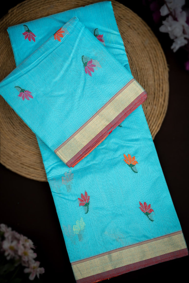 Mandir Sky Blue & Maroon Chanderi Motifs Saree