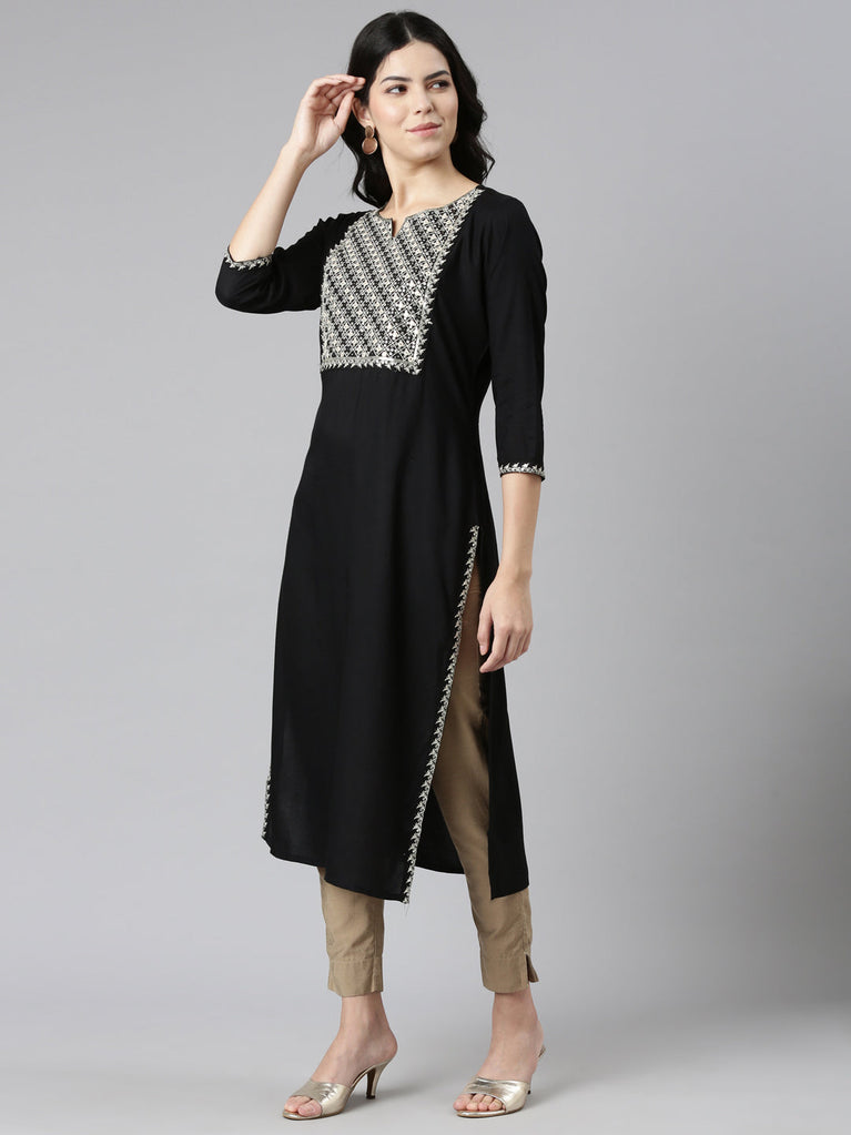 Neeru's Black Regular Straight Embroidered Kurtas