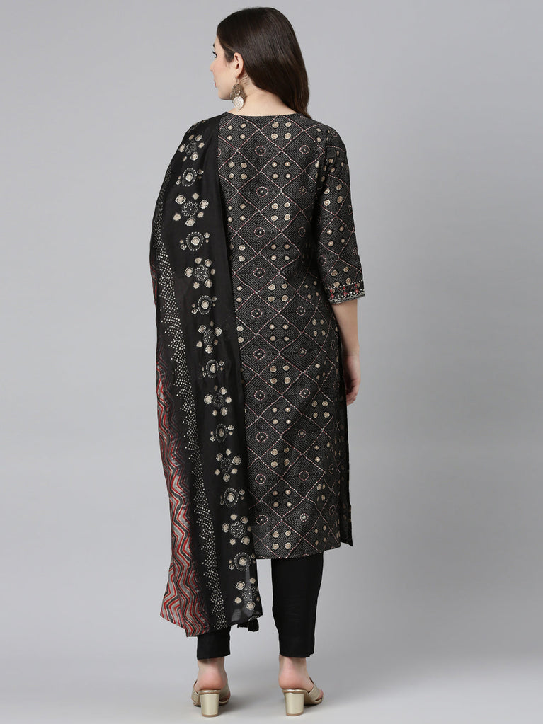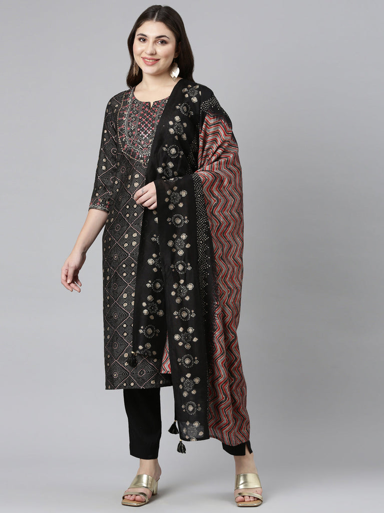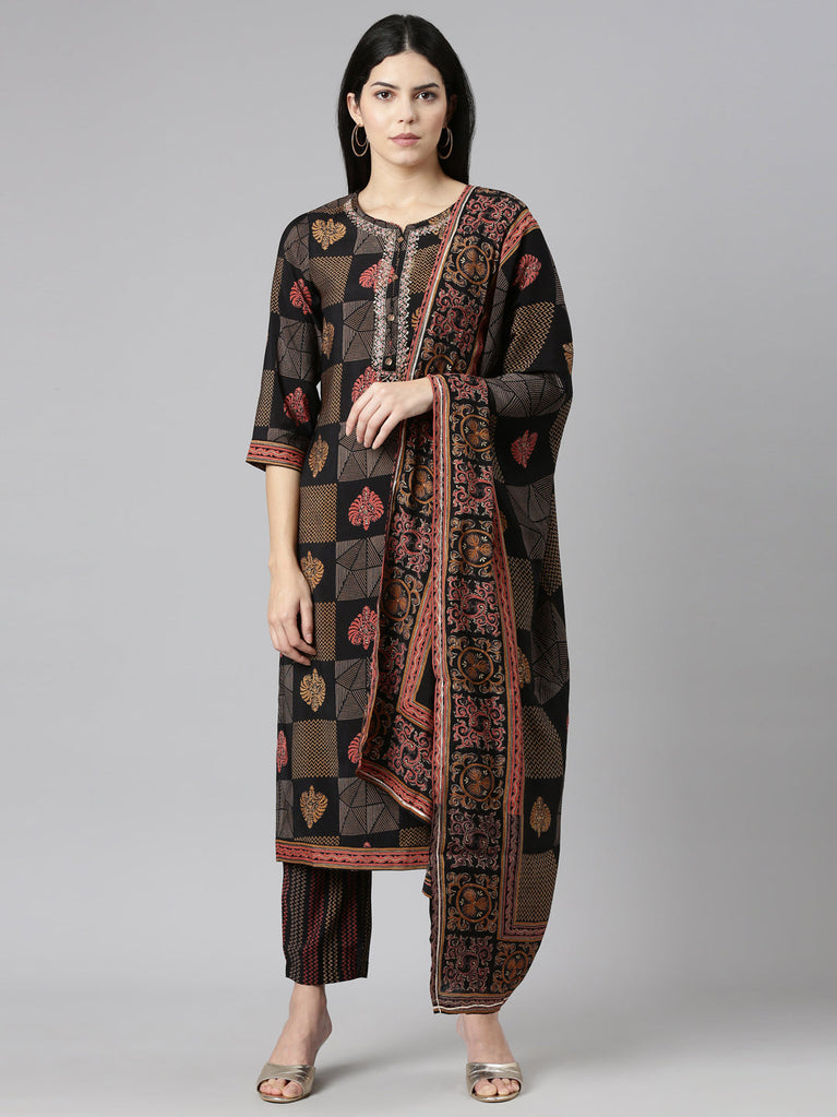 Neeru's Black Regular Straight Printed Readymade Suits