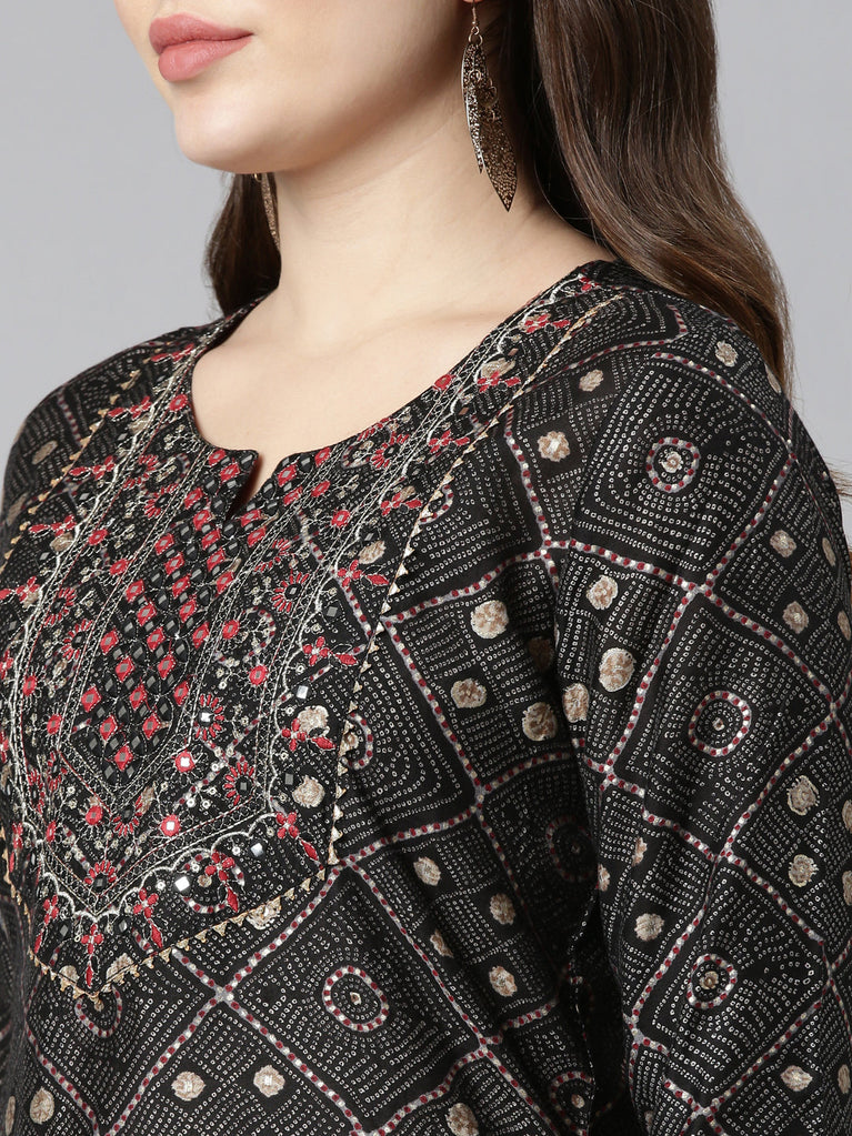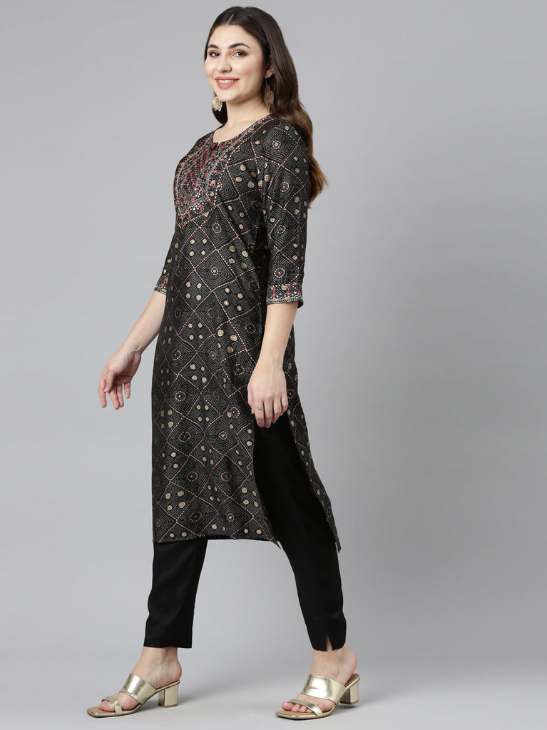 Neeru's Black Regular Straight Printed Kurtas