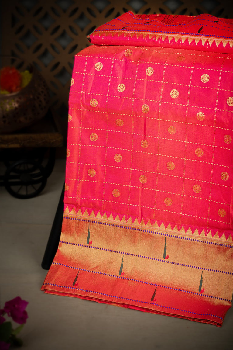 Varamahalakshmi Light Pink & Gold and Red Paithani Checks And Buttis Saree