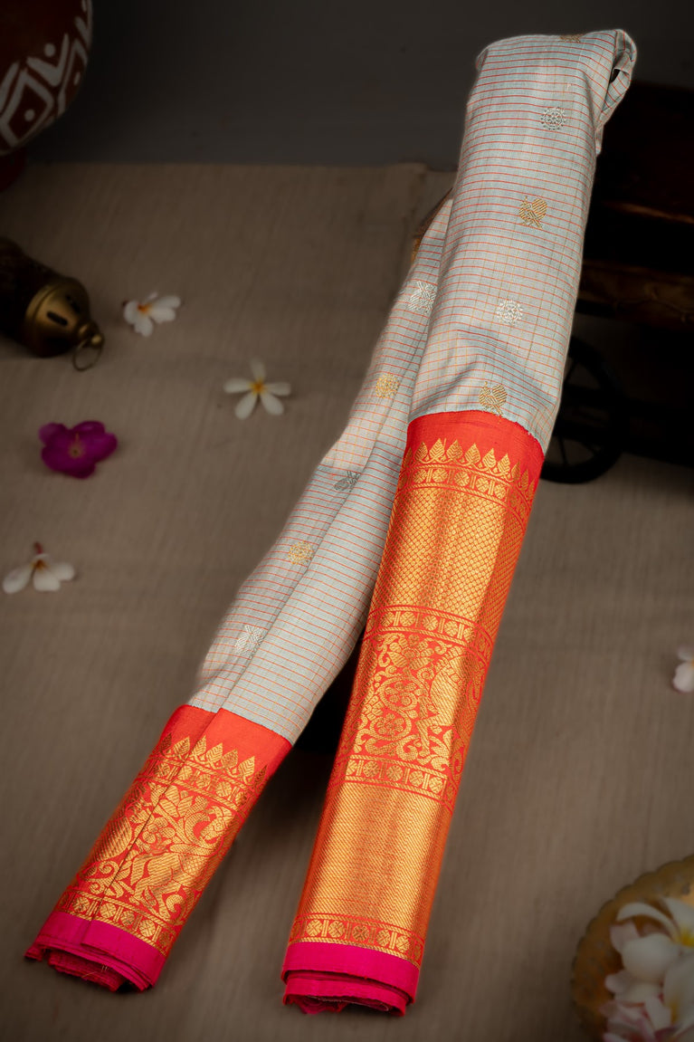 Varamahalakshmi Light Grey & Orange Gadwal Buttis Saree