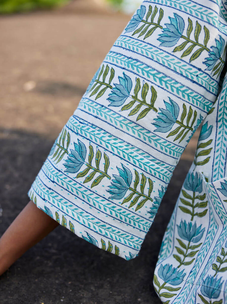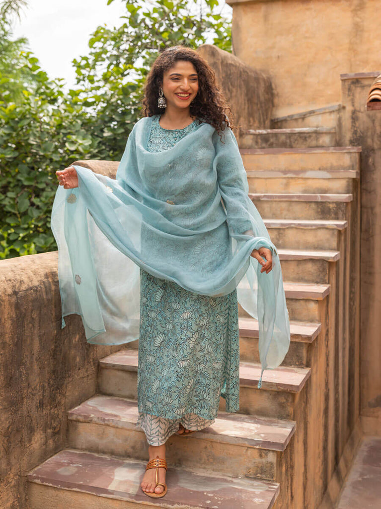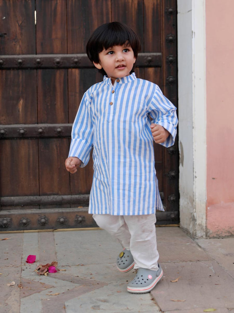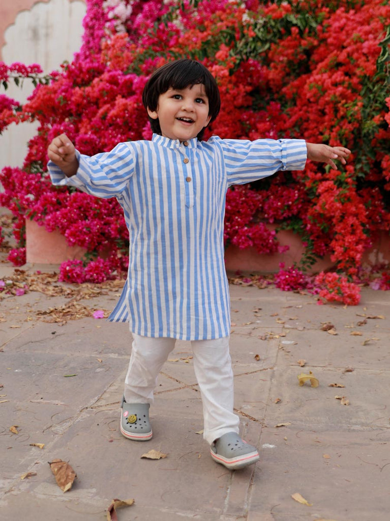 Sky Blue Stripes Organic Cotton Block Printed Long Kurta