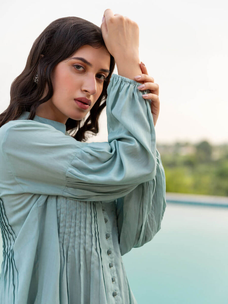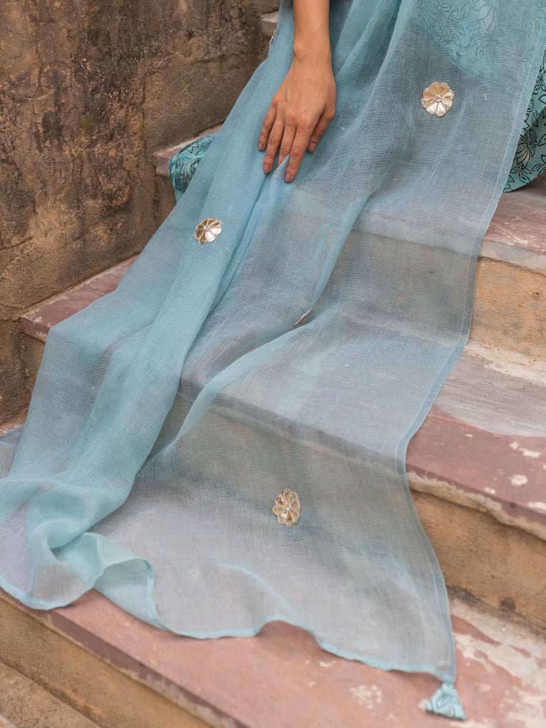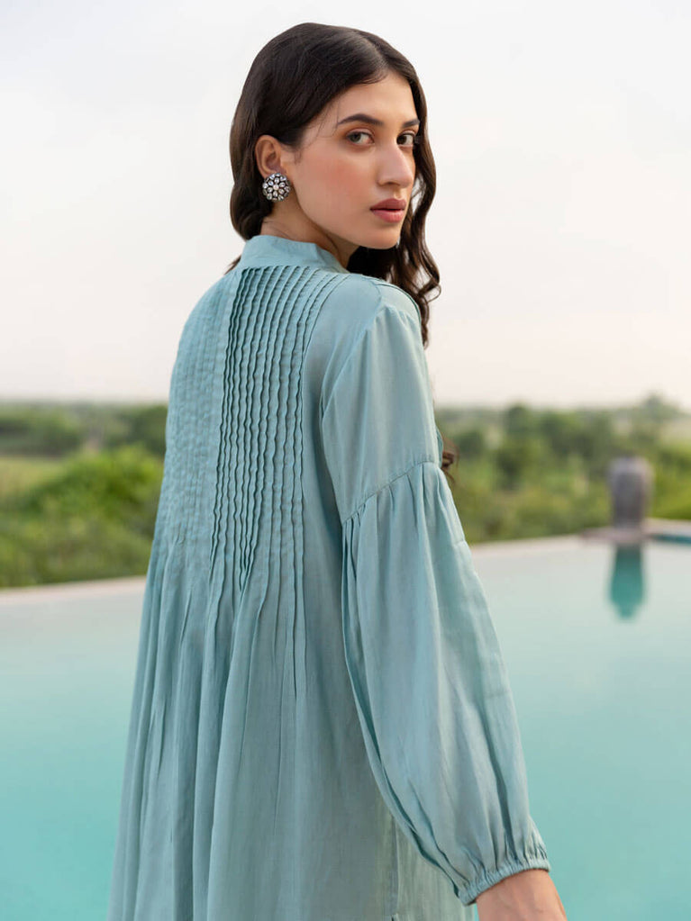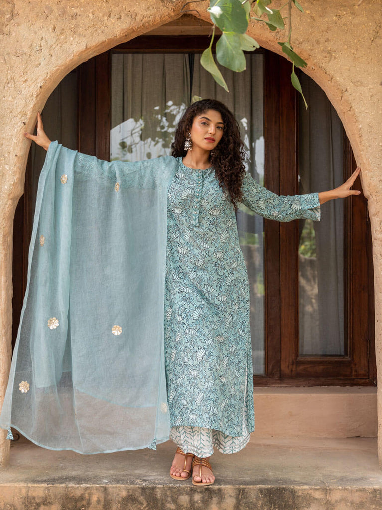 Sky Blue Stripes Organic Cotton Block Printed Long Kurta
