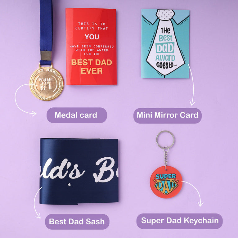 Dads fix everything—broken toys, bad days, and hearts. They give strength, safety, and the best bear hugs. Celebrate your dad with the Super Dad Hamper this Father’s Day.Because your first superhero deserves nothing less. The hamper includes:Pocket Hug Card - Give your dad a hug that fits in his pocket (and his heart). When you can’t be there to hug him, this heart-shaped pocket hug will do the trick. It’s tiny, adorable, and full of cuteness. And, it also comes with a card that has a sweet message for your dad.Best Dad Ever Table Top - An intricate work of art to adorn your dad's bedroom with. Made with lots of love and creativity, this gift tells him everyday that he is the best dad ever! And, you know the best part? You can customise the table top with his favorite picture. Go ahead, and make his day. Mirror Card - Here’s a magical greeting card for your amazing dad! This special greeting card is designed with a mirror attached so that when your dad opens the card, he will see his face reflecting on it.Badge - A badge of honor for the number one dad! It is an adorably sweet way to remind your dad that he is the best dad ever.A Sash - Fathers are the real superheroes! Make your dad feel like one with this adorable world's best dad sash.Specifications -Size of the Hamper box : 14 x 17.8 x 7 cmsBest Dad Sash : Regular SizeSize of the Table Top : 12.7 x 13.7 cmsSize of the Badge : 3.8 x 4 cmsSize of the Pocket Hug Card : 11 x 15 cmsPocket Hug Soft Toy : 7.2 x 6.2 cmsSize of the Mirror Card : 12.5 x 17.7 cms
