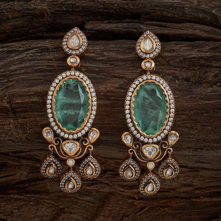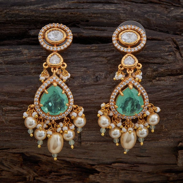 Kushal's Sea Green Kundan EarringElevate your glam quotient by wearing green Kundan earrings. These dazzling earrings are embellished with stonework. They are in the shape of flowers. These lovely accessories have a charming vibe and look adorable when paired with traditional or festive attire.