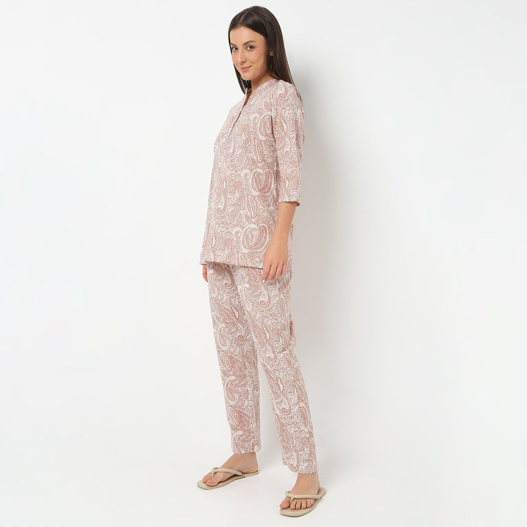 Band Collar Three-Fourth Sleeve Printed Jaipuri Top With Pyjama Sleepwear Set