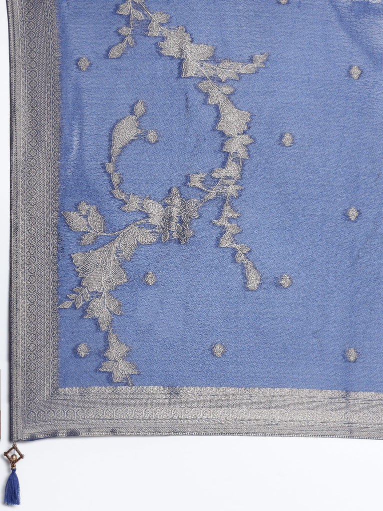 Elevate your wardrobe with this midnight blue three-piece crepe suit set featuring intricate thread work. The royal blue crepe fabric is expertly crafted with delicate gota patti embellishments on the neck and sleeves, adding timeless elegance. Paired with an ethereal organza dupatta, this ensemble effortlessly blends sophistication and grace for any special occasion.