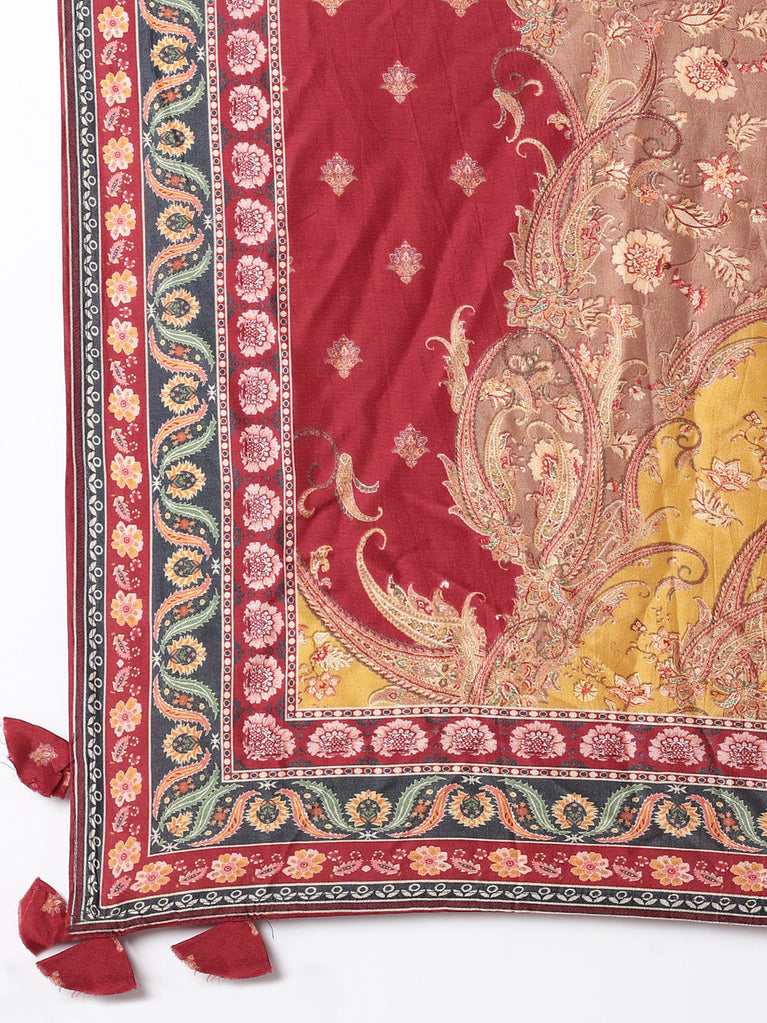 Maroon Crepe Printed Three Piece Suit Set