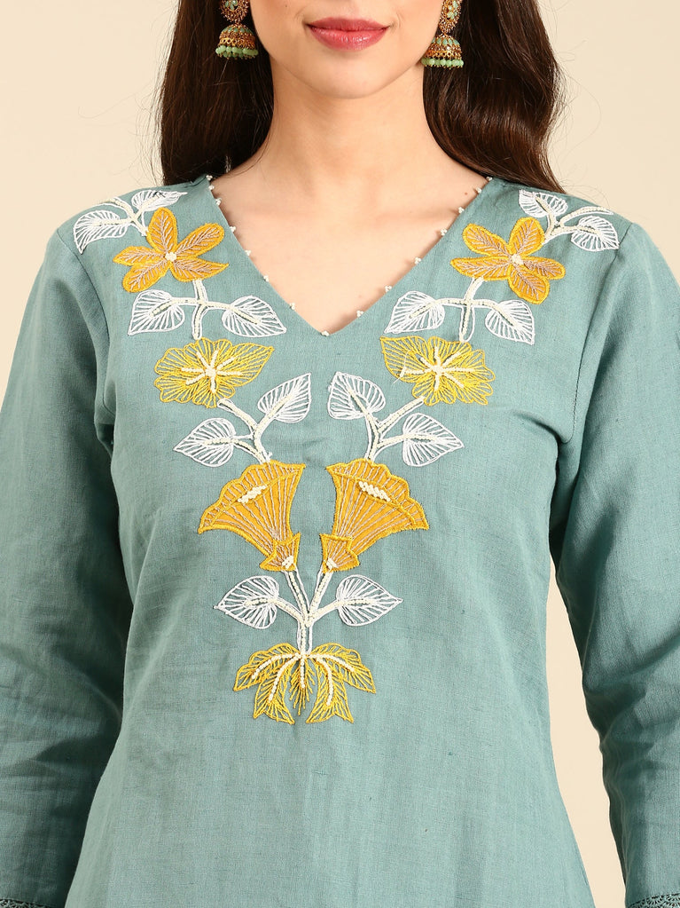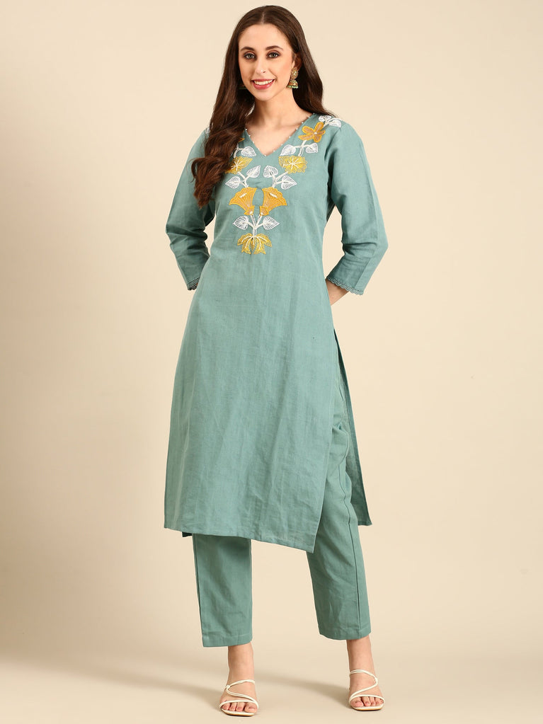 Mint green linen thread embroidery two piece suit set