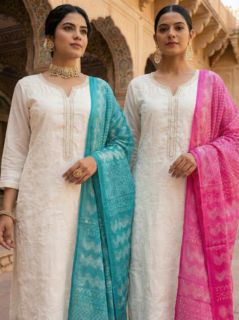 Elevate your ethnic wardrobe with this exquisite cream silk three-piece ensemble, meticulously crafted with intricate hand embroidery. Each piece showcases traditional artistry combined with luxurious silk fabric, offering unparalleled comfort and sophistication. Perfect for weddings, festivals, and special occasions, this set brings timeless elegance to your collection. The delicate embroidery work adds a touch of refined beauty, while the cream tone ensures versatility with your existing accessories. Invest in quality craftsmanship that celebrates heritage and style.