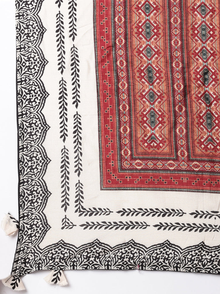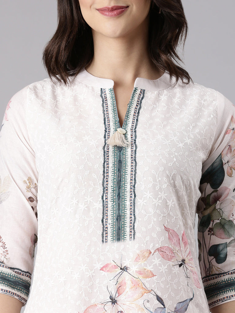 Cream Slub Cotton Printed Three Piece Set
