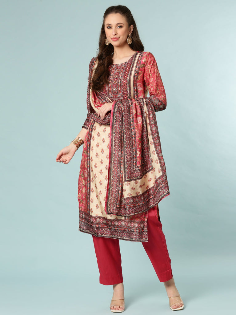 Deep Caramine Dola Silk Printed Three Piece Set