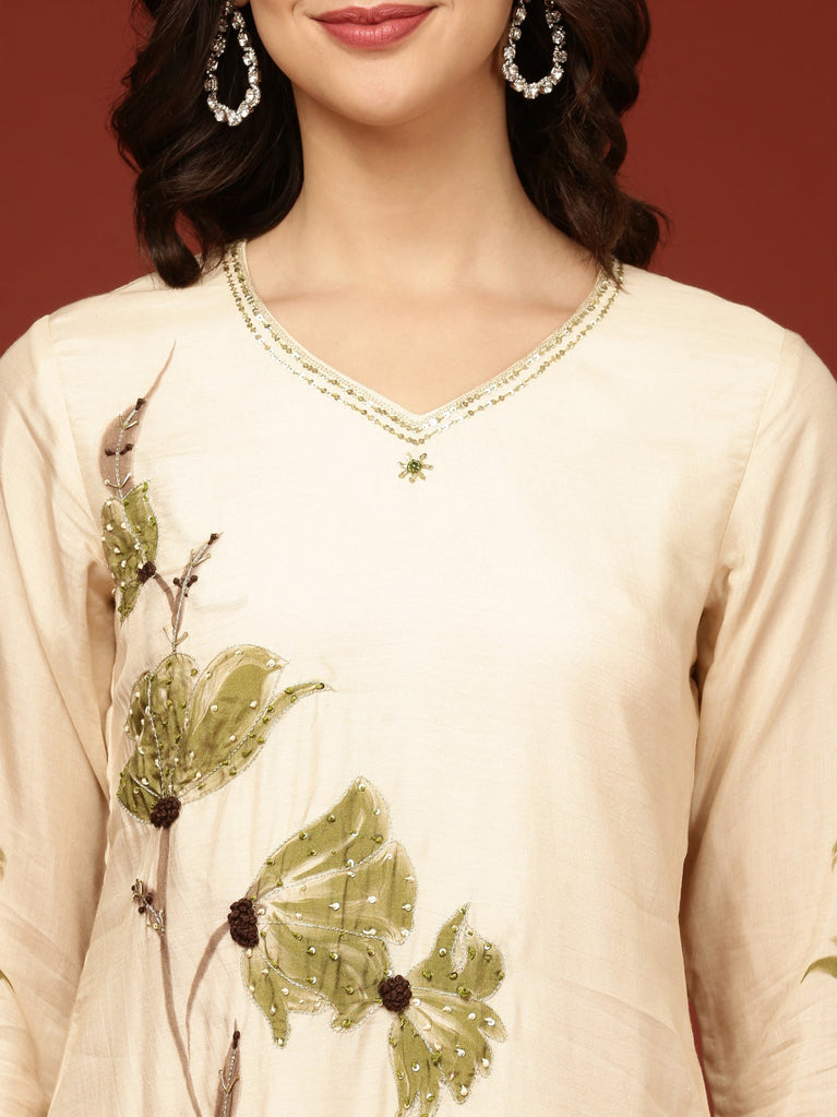 Cream Silk Hand Embroidery Three Piece Set