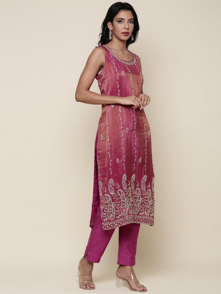 Elevate your wardrobe with this Magenta Tissue embroidered three-piece suit set. Crafted from lightweight tissue fabric, it offers a refined texture and graceful drape. The delicate embroidery adds an elegant touch, perfect for formal occasions. This set includes a beautifully embroidered kurta, matching bottoms, and a coordinating dupatta, combining comfort with timeless sophistication. Ideal for those seeking a poised and stylish ensemble.