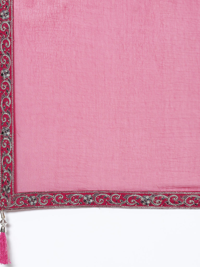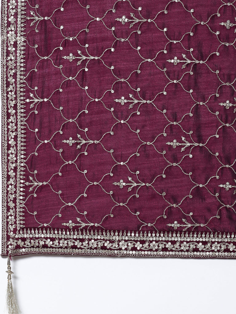 Elevate your wardrobe with this magenta silk three-piece set, expertly crafted with intricate embroidery that adds timeless elegance. The set features a finely detailed blouse and matching bottom, complemented by a contrasting dupatta that enhances the ensemble’s vibrant appeal. Perfect for festive occasions or formal events, this carefully designed outfit combines traditional artistry with luxurious fabric for a distinguished, sophisticated look.