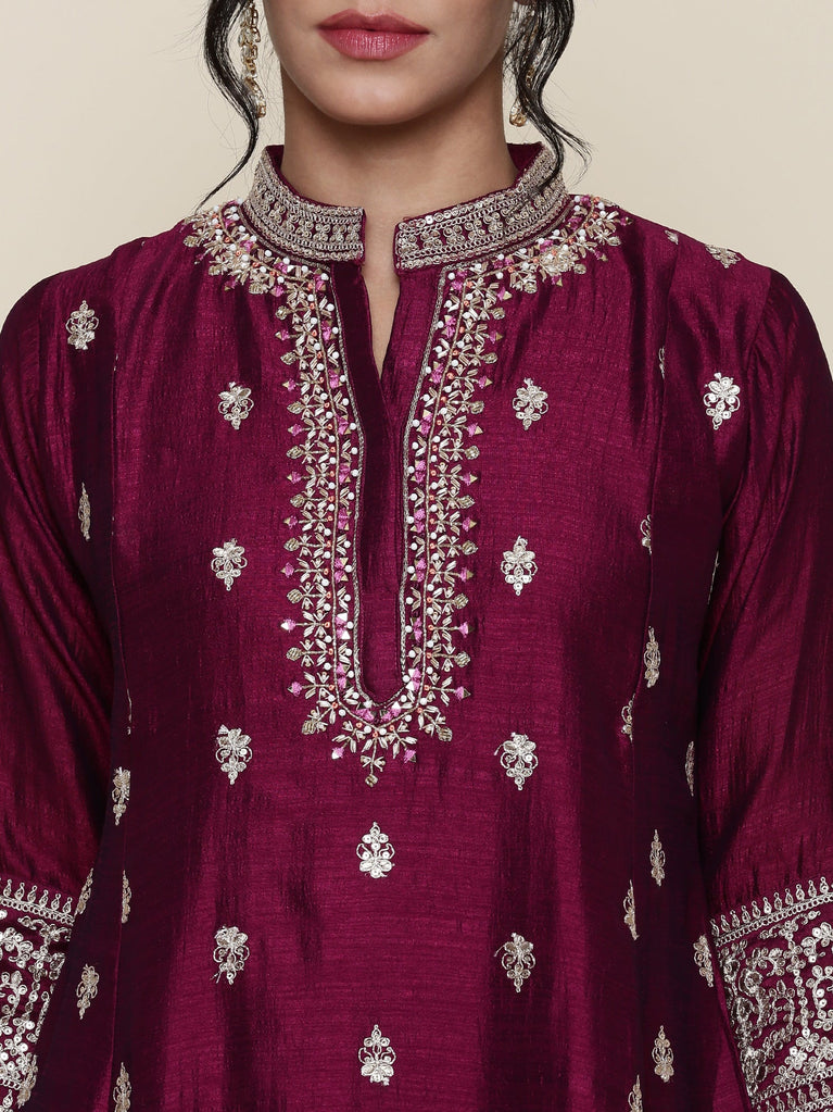 This magenta silk embroidered three-piece Anarkali set showcases expert craftsmanship with its luxurious silk fabric and detailed embroidery. The flowing Anarkali design provides an elegant silhouette, complemented by matching pieces that enhance its traditional appeal. Ideal for formal events and festive occasions, this ensemble offers both sophistication and comfort, ensuring a refined and memorable look.