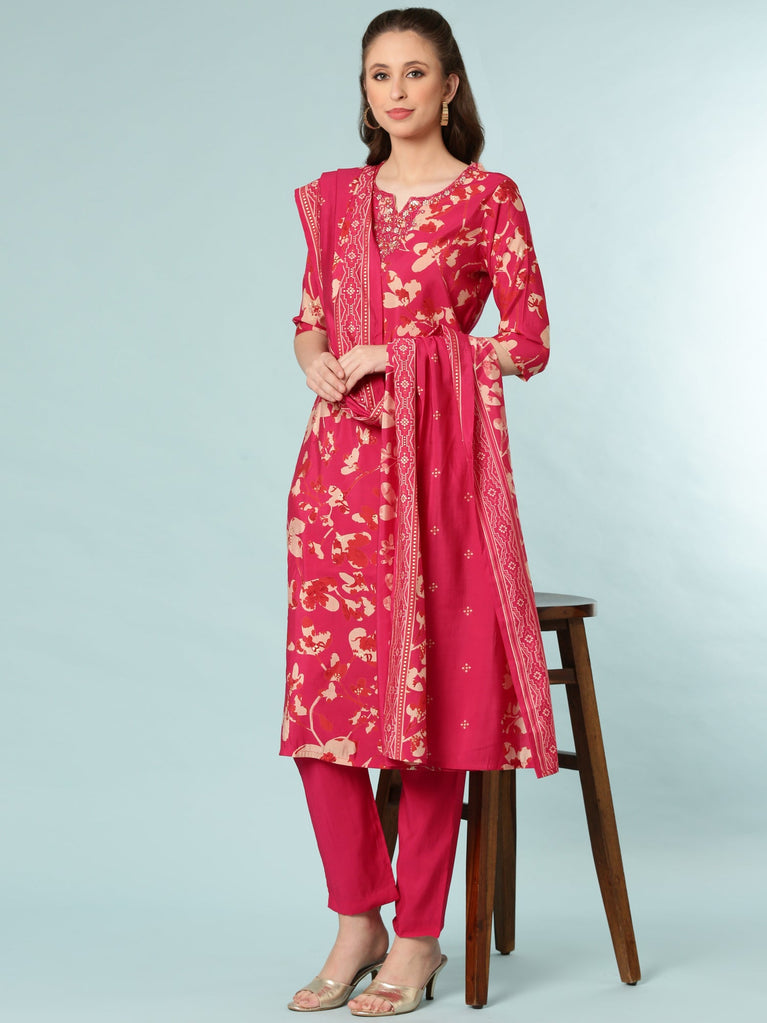 Elevate your ethnic wardrobe with this stunning magenta three-piece set crafted from luxurious dola silk. The vibrant digital print adds contemporary flair to traditional styling, making it perfect for festive occasions, celebrations, or everyday elegance. This versatile ensemble combines comfort with sophistication, allowing you to express your personal style with confidence. The rich magenta hue complements various skin tones beautifully, while the premium silk fabric ensures a graceful drape and lasting quality. Ideal for those who appreciate the perfect blend of modern design and timeless tradition.