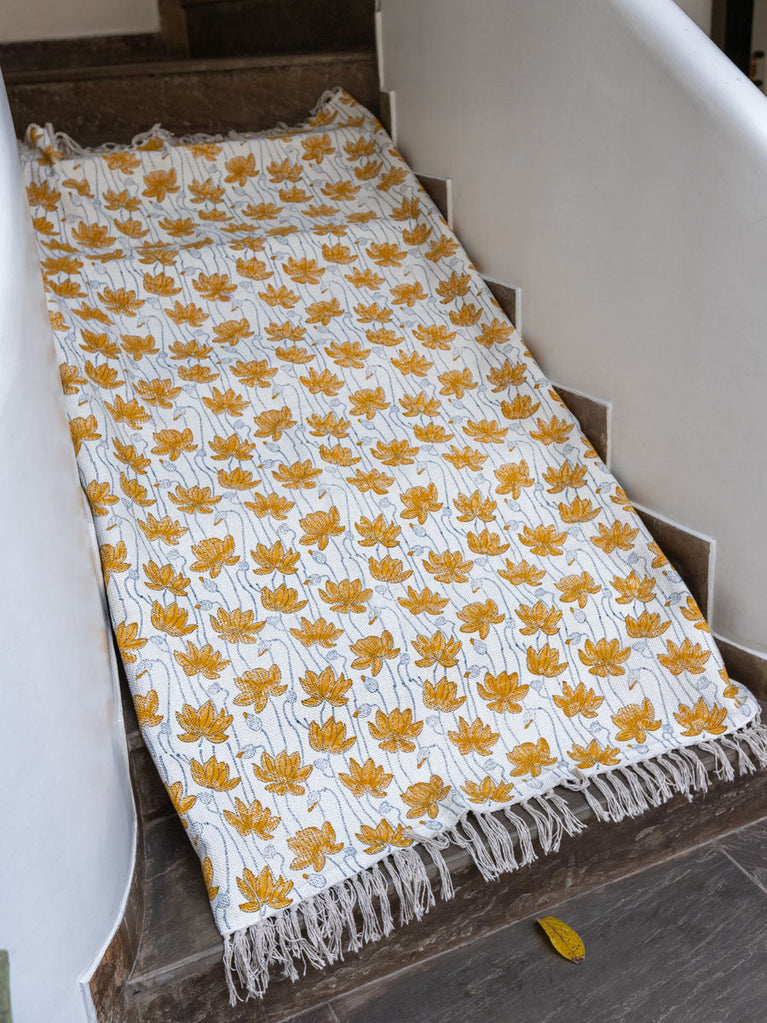 Mustard Lotus Block Printed Cotton Dhurrie Rug