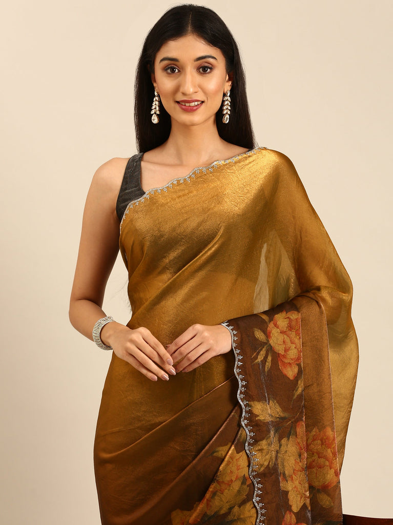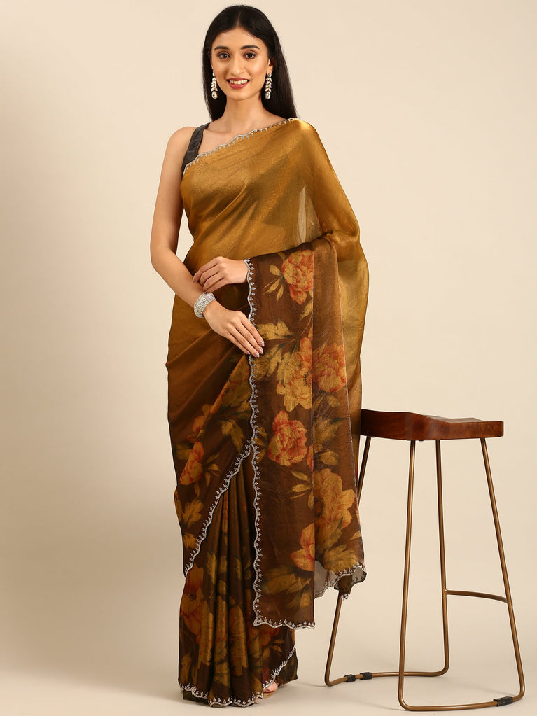 Gold & rust floral printed Jimmy tissue saree with swarovski embroidery