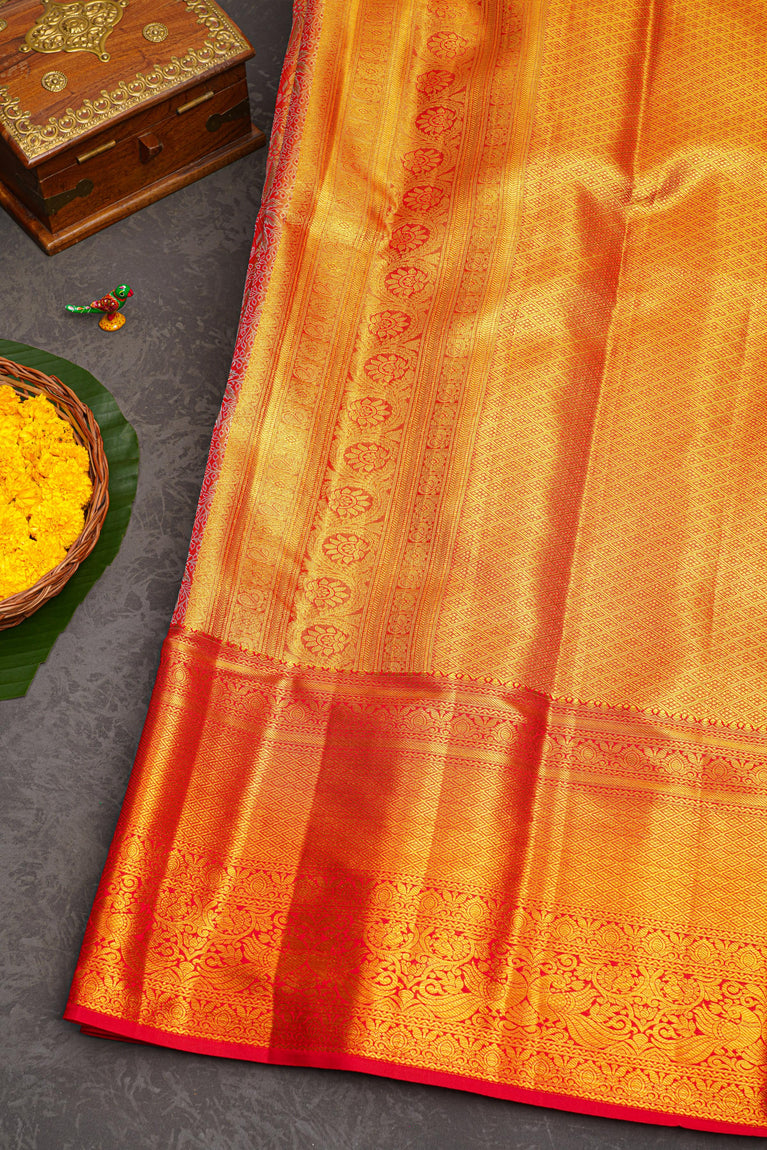 A striking gold orange kanjivaram silk saree featuring floral ogival pattern in gold and tilfi zari weaving. The contrasting big border showcases floral and kaddi pattern, while the pallu has continuing floral pattern all over. An heirloom piece perfect for special occasions.