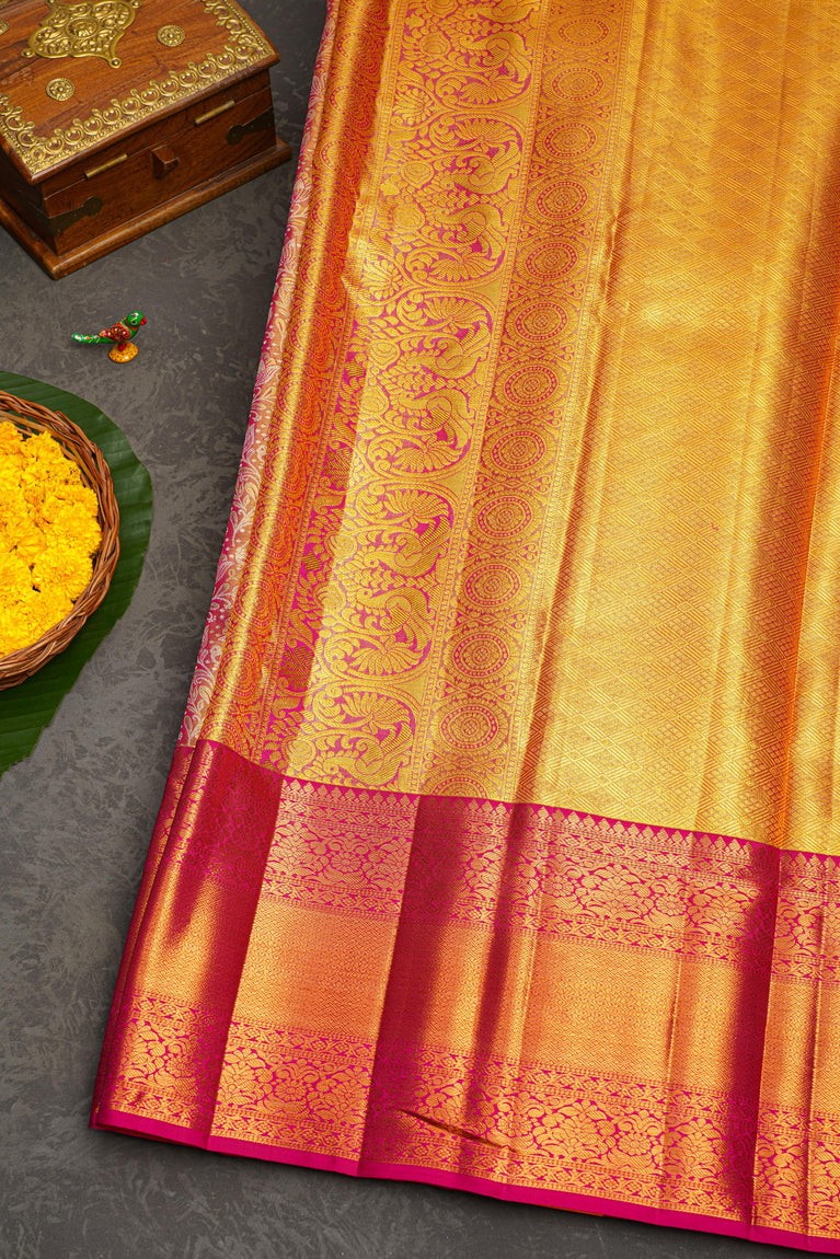 A georgia peach kanjivaram silk saree where the body features delicate floral motifs in gold and tilfi zari, complemented by a rich pallu displaying classical temple floral motifs. The contrasting big border accentuates the whole look. Perfect for bridal ceremonies and traditional functions.
