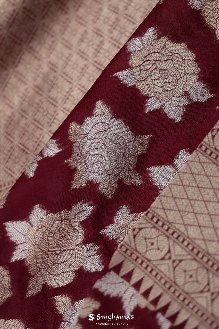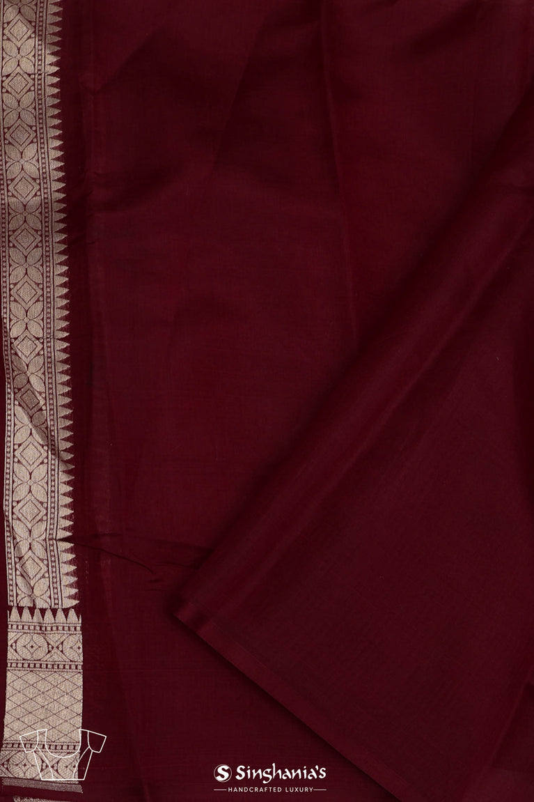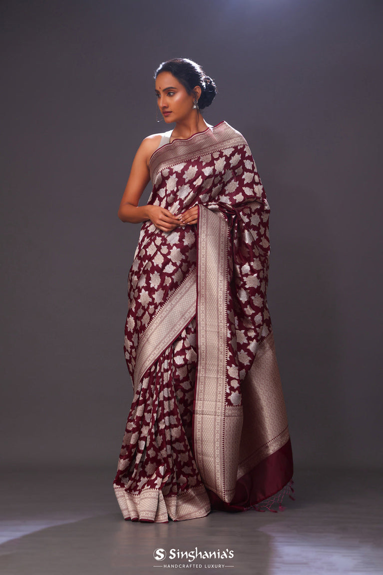 This is a jam purple banarasi silk saree for festive, wedding occasions and party wear. Adorned with gold and silver zari floral butta weaving all over the body and a small, floral geometrical border and pallu, completing the whole look.