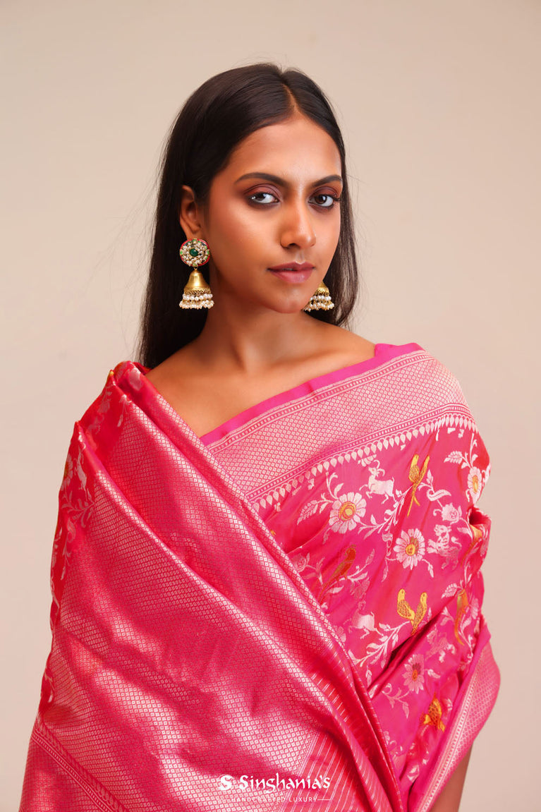 This is a silk banarasi punch pink saree for festive, wedding occasions and party wear. Adorned with gold and tilfi zari floral-jungle motif jaal weaving all over the body and a small, diamond butti border and pallu, completing the whole look.