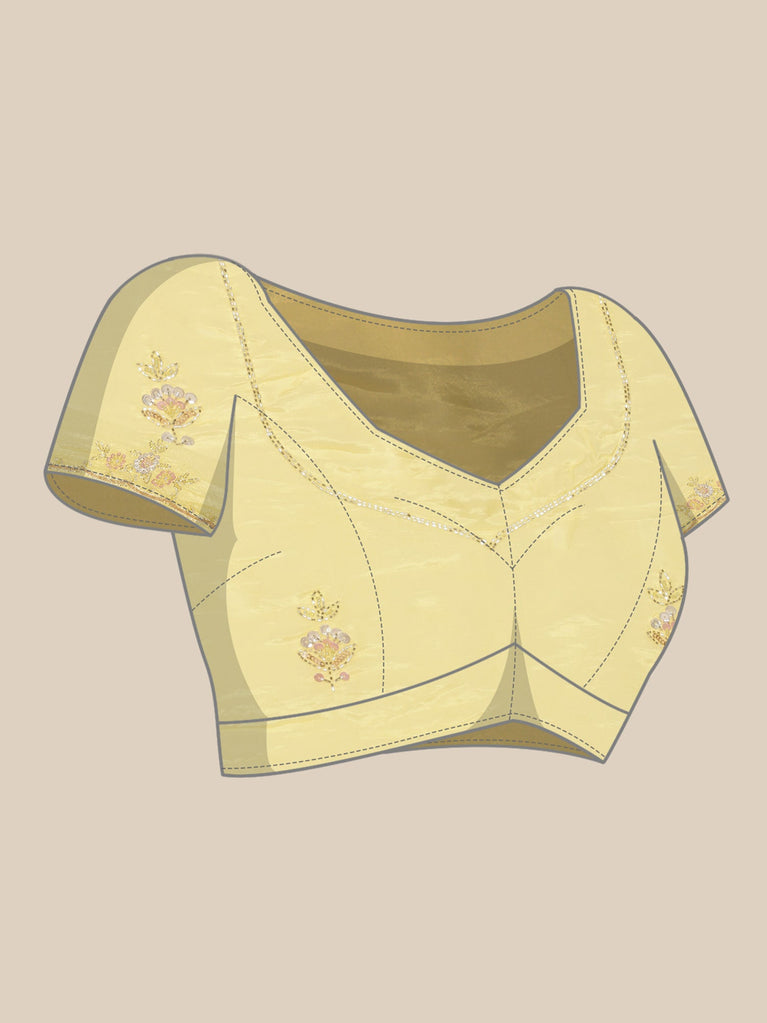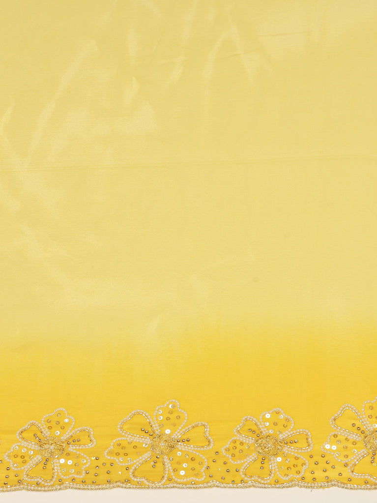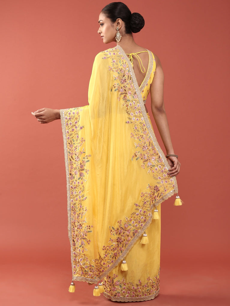 A luminous lemon yellow saree with a tissue base, which features floral buttis on the body. Accentuated with a small floral embroidery and scallop edged border made with sequins & glass beads, that adds to the whole look. Suitable for festive wear and wedding parties.