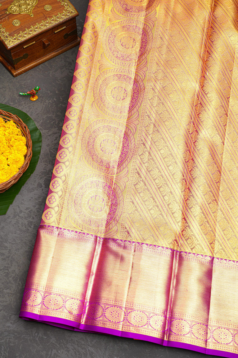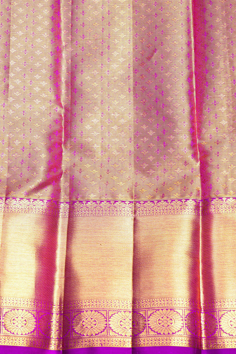 This is a traditional purple tissue banarasi saree for festive, wedding occasions and party wear. Adorned with gold zari floral butta jaal weaving all over the body and a small, floral creeper border and pallu, completing the whole look.