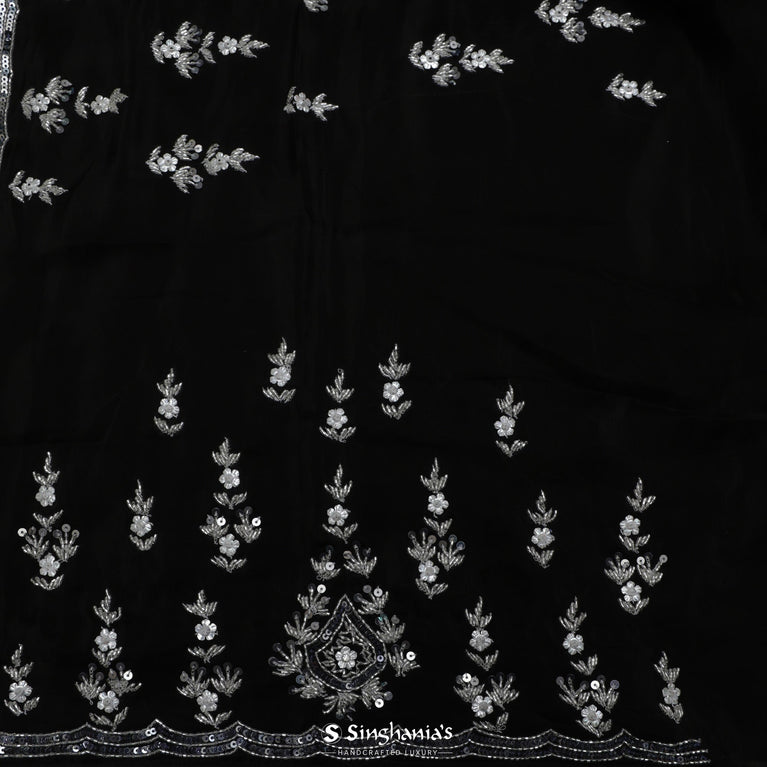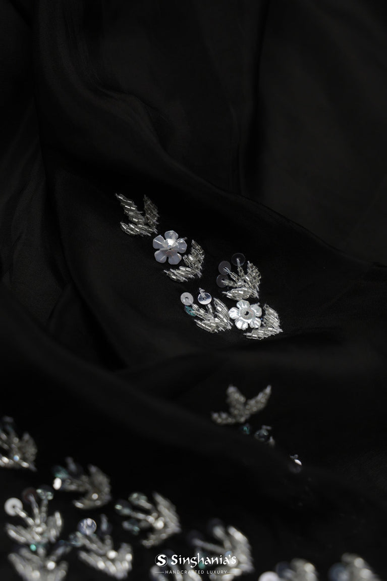This handcrafted Night Black Tissue Organza Saree is perfect for office wear, weddings, or festive occasions. The saree features floral buttis and a small floral border, designed with sequins and glass beads, creating an enchanting look.