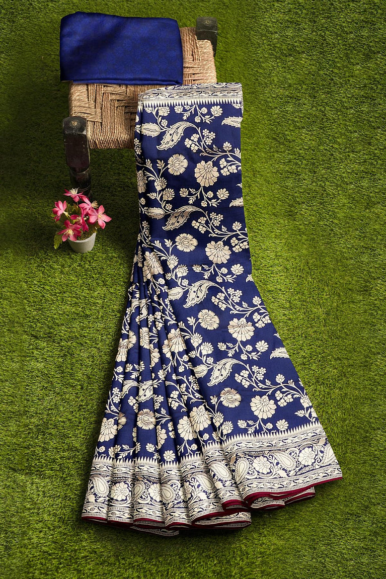 NAVY BLUE and GOLD FLORALS SILK Saree with FANCY
