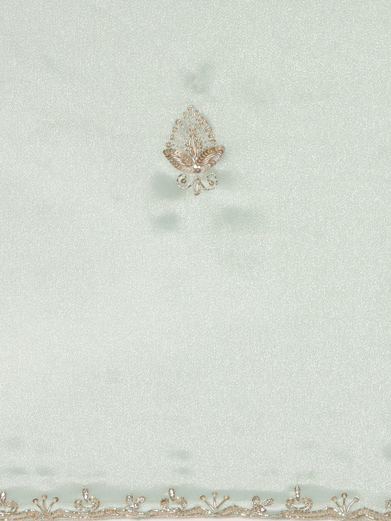 This elegant bottle green Jimmy saree features intricate cut Dana and pearl embroidery, enhancing its rich texture and adding a refined touch. Paired with a ready-made blouse, this ensemble combines traditional craftsmanship with modern convenience, making it perfect for festive occasions or formal events. The detailed embroidery highlights the saree's luxurious appeal while offering effortless style.