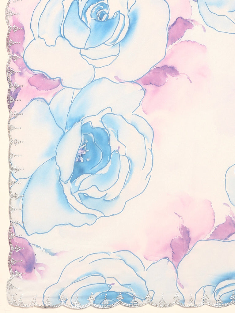 Blue satin floral printed saree with Swarovski embroidery